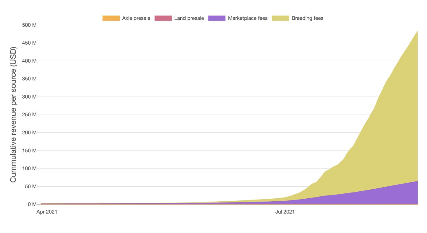 Breeding fees. They charge 2AXS or ~$140 USD as at August 27th and some SLP to breed an Axie. As you can see in the purple/yellow chart above, this is their primary method of revenue generation.