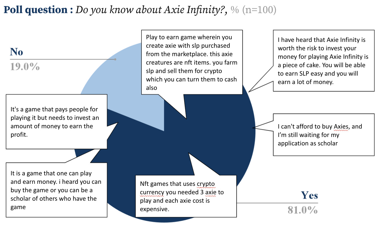 As someone that has a bit of a network in the Philippines, I thought I’d dig in and investigate a bit. Polling some colleagues there, I found that 50% (or 3 of 6) folks had already heard of the game. That’s wild for a game that really didn’t exist in a big way more than 3-months ago. Out of curiosity I took it a step further, and polled 100 people. Turns out 80% said they’d heard of Axie Infinity. Now, it is possible that both these figures are inflated because the educated folks I know, and the folks filling in Pollfish online are more likely to be informed of Axie. Irrelevant, the concept that anywhere near even ~50% of people learned about a game in < 3-months with minimal marketing spend is wild. Here’s the results of that poll :