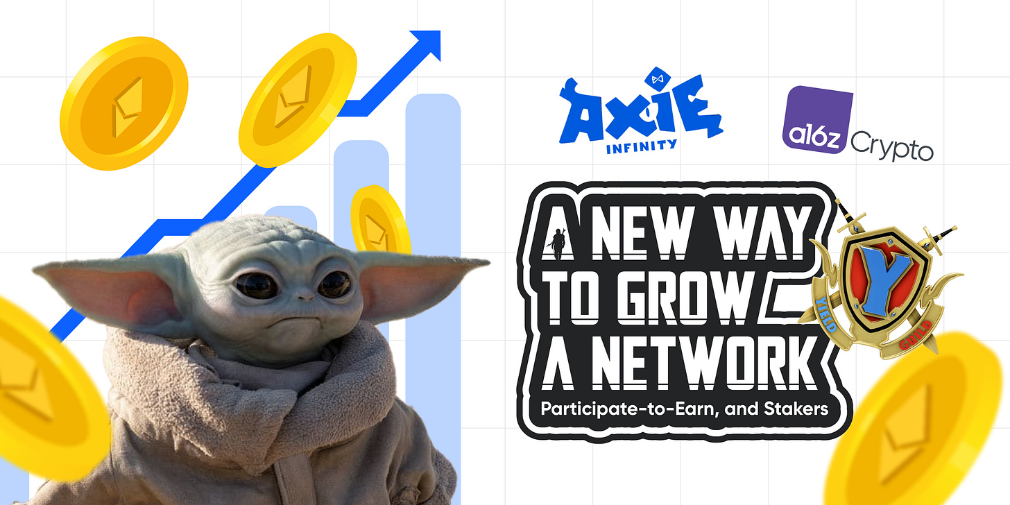 In this post we’ll look at Axie Infinity and Yield Guild Games as a couple specific and interesting case studies on the power of community and incentives to grow a network, and how the new concepts of Participate-to-Earn, and Stakers play into that.