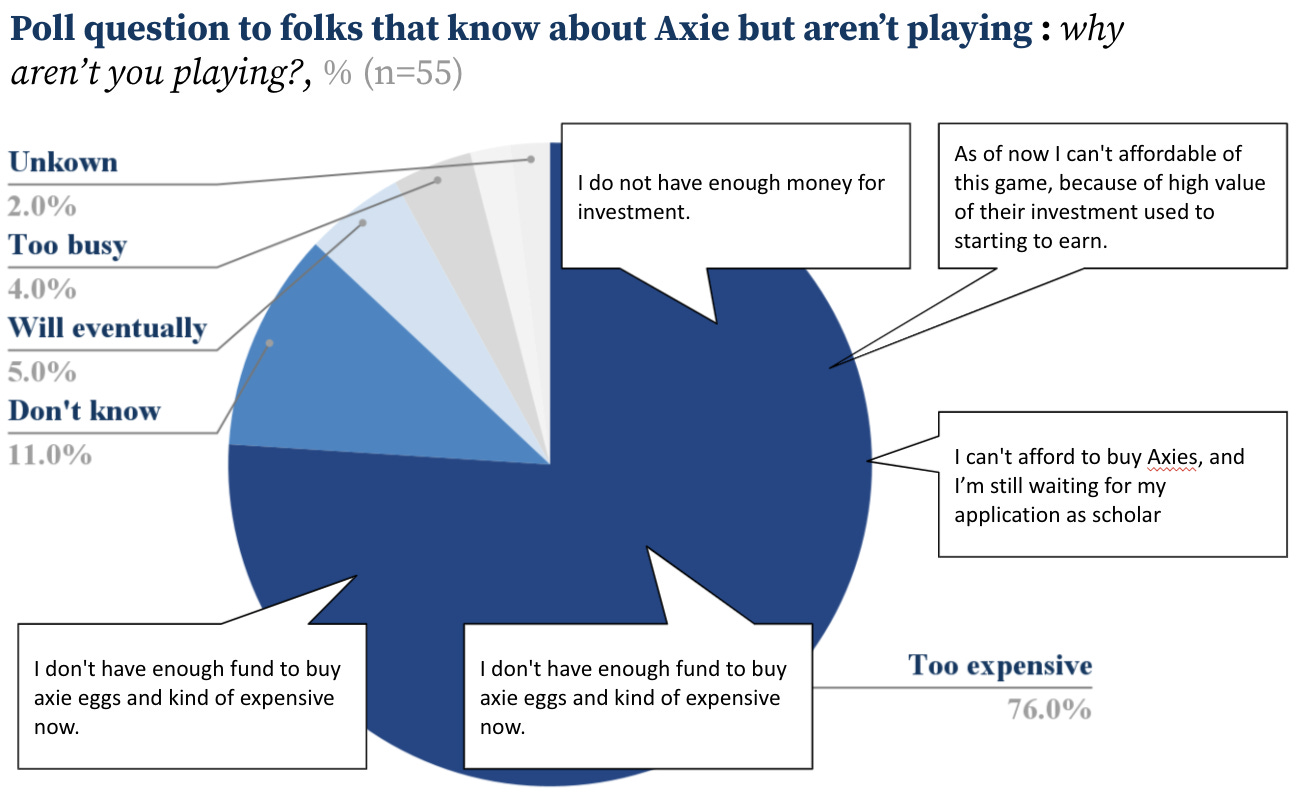 For those of the 100 folks that had heard of it and weren’t playing, I asked them why they weren’t engaging. 76% of those folks said they weren’t playing simply because it was too expensive. Makes sense. In order to start playing you need to buy 3 Axies (or ~$600 today). Enter Stakers.